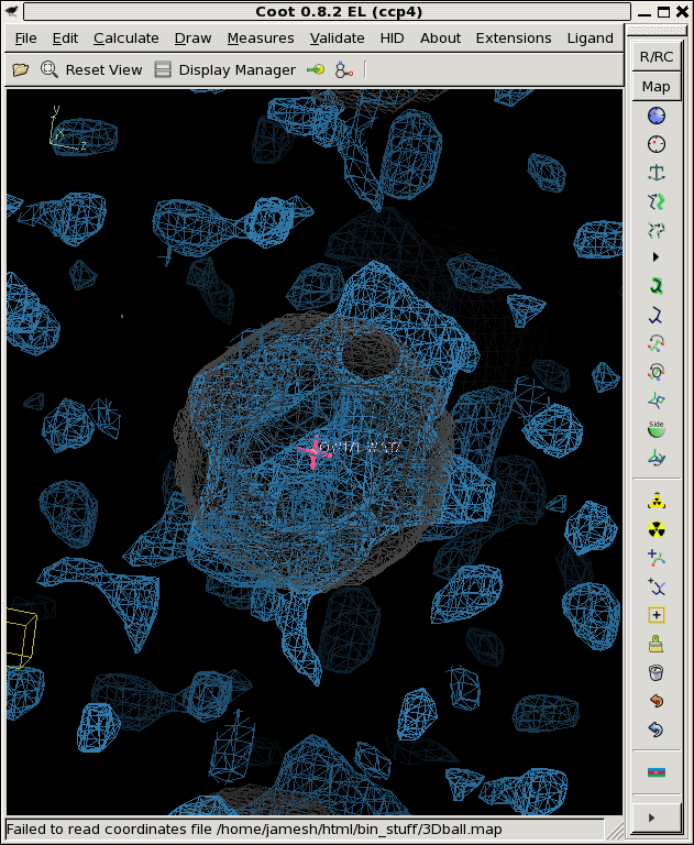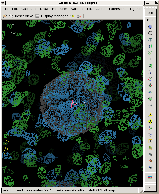 ./float_add -header 1104 3Dball.map grand1_2A.map -scale2 5.71 noisy1.map ./float_add -header 1104 3Dball.map grand2_2A.map -scale2 5.71 noisy2.map ./float_add -header 1104 3Dball.map grand3_2A.map -scale2 5.71 noisy3.map coot -p 3Dball.pdb --map noisy1.map --map noisy2.map --map noisy3.mapThe faint grey ball is the "right answer", or 3Dball.map we started with.![]()