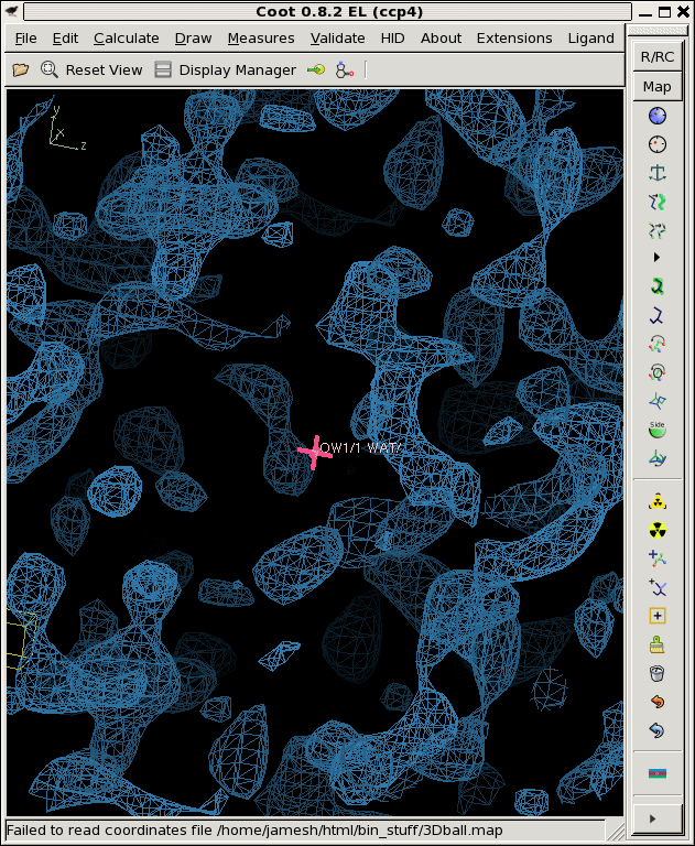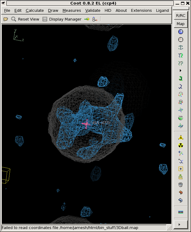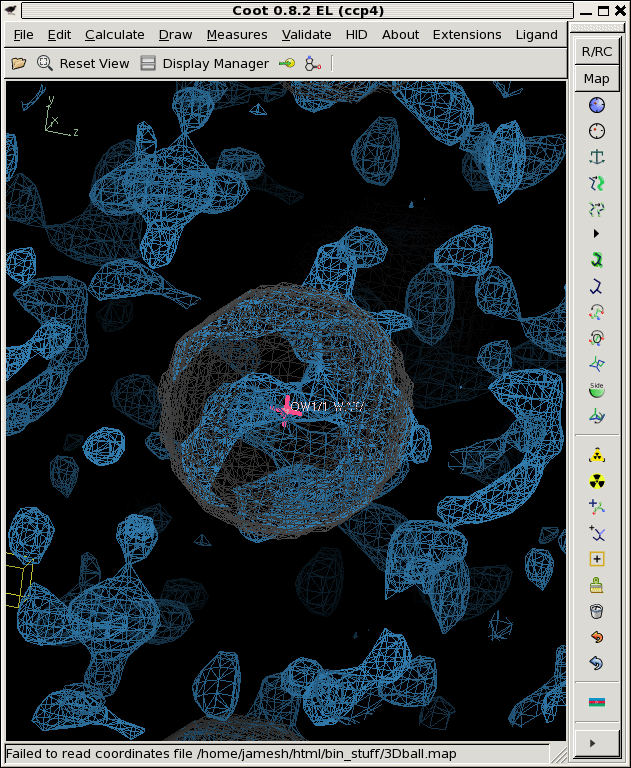 ./float_func -header 1104 -func divide avg.map rmsd.map -output snr.map filename: avg.map filename: rmsd.map selected function: DIVIDE header = 1104 bytes reading 32768 floats from avg.map input1 is: avg.map input2 is: rmsd.map output to: snr.map allocating 32768 pixels 32768 pixels max = 89.0023 min = -196.423 mean = 0.205735 rms = 2.17678 rmsd = 2.16704 writing snr.map as a 1104-byte header and 32768 4-byte floats ./derez.com snr.map 2 coot -p 3Dball.pdb --map snr_2A.mapWhich gives you some idea of what might be "there" if you contour at 3 sigma or so (as shown).![]()