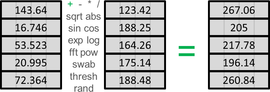 This simple program reads one or two flat files of 4-byte single precision "float" numbers and operates on them using a variety of user-selectable functions. Essentially the full C standard library is available, plus a few extras. Data in the files can be simply added, subtracted, multiplied or divided, or the first taken to the power of the second, run through a bessel function, take an FFT, swap bytes, convert amplitude-phase pairs into complex numbers (a,b), any trigonometric or hyperbolic trig function, minimum or maximum of the two inputs, cut at a threshold, set to zero, sqare root, cube root, exponential, log, error function, or replace with random values from six different distributions. A full description of all the options is given in the command-line description below. The output is a new flat file of 4-byte single-precision "float" numbers.