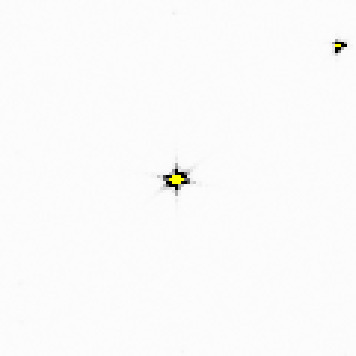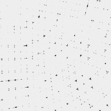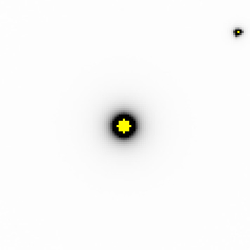 ./noisify -floatfile floatimage.bin -header nanoBragg.img -scale 1000 -readnoise 3 mv noiseimage.img upscaled.img adxv upscaled.imgNow you can see the weak inter-Bragg features (left) that were rendered by nanoBragg, but too hard to see in the original output. Some of the spots are very bright (right), but the tails of the normal point- spread function of a fiber-coupled CCD detector are not apparent. These can be turned on in noisify, however, with a simple switch:![]()