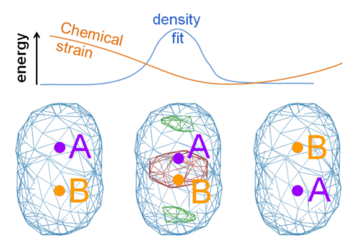 I can't believe how many years it took me to notice this, but two or more atoms in the same blob of density have a really hard time passing through each other. This is because the calculated electron density at the moment the two atoms are on top of each other is up to twice as high and twice as sharp as it is when they are separated. This poor agreement with the observed density is a significant barrier to optimization. As you can see in this figure:
