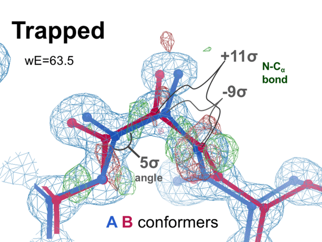 Now refine otw39.pdb against the same data as before: refme.mtz. This model has exactly the same atoms as best.pdb with exactly the same connectivity, but refined from a different starting position. The stats are notably worse: Rfree=3.4%, wE=63.5. Several geometry outliers are striking, such as the N-Cα bond of Ala39, which is 11 sigmas too long. It may surprise many that refinement does not fix this: not refmac5, not coot, not shelxl, not phenix.refine, simulated annealing or any standard protocols therein can turn otw39.pdb into best.pdb, despite them being rms 0.02 A different. otw39.pdb is trapped in a local minimum. That is the animated picture at the top of this page.