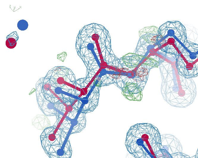 Underlying data extend to 1.0 A resolution, blue map is 2mFo-DFc contoured at 1.0x rmsd, red and green are mFo-DFc contoured at 3.5 x rmsd.