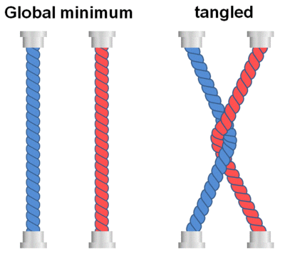 If the ropes are the same length as the distance from floor to ceiling, then straight up-and-down is the global minimum of mechanical strain (left). If, however, the ropes take a different route, they form the simplest possible type of tangle (right). Escaping this trap cannot be acomplished with minimization (pulling on the ropes). Instead, the system must be re-built without the tangle. In the case of ropes, it is van der Waals forces that prevent the strands from passing through each other. In the case of atomic models, it is not van der Waals, but the density fit energy that keeps the chains from passing through each other.