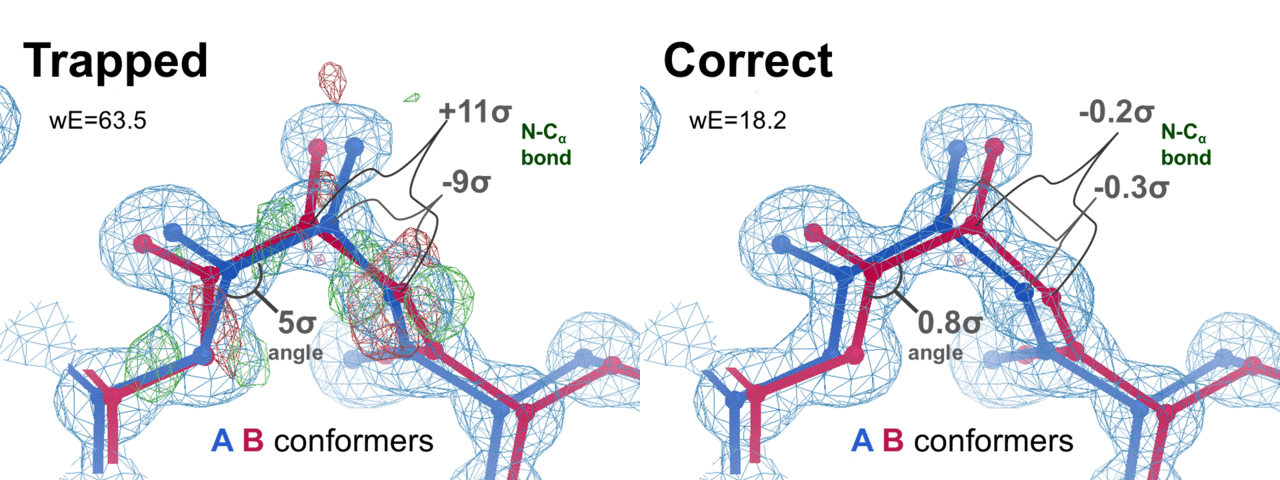 where the sigma (σ) (taken from Phenix) is the rms deviation expected of the bond, angle, etc. v0 is the ideal value and v the value in the model. The ground truth here has no significant deviations from ideality. For non-bonded interactions, I use a Lennard-Jones 6-12 potential, wich has a much stronger penalty for clashes than the 4th-power anti-bumping typically used in refinement. I also add an extra penalty for each Molprobity clash. The ground truth here has no clashes. I further add an extra penalty for twisted peptide bonds (omega). The ground truth has no peptides twisted more than 9 deg. The probabilities output by molprobity.ramalyze and molprobity.rotalyze are converted into a sigma-scaled deviate and therefore energy using the inverse error function. The ground truth has three unpopular rotamers. C-beta deviations also contribute a statistical energy with a presumed sigma=0.05 A. In this way, all validation metrics are all converted into statistical energies, which are now on the same scale.